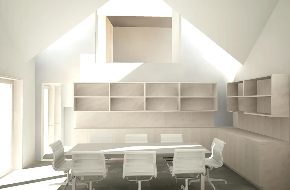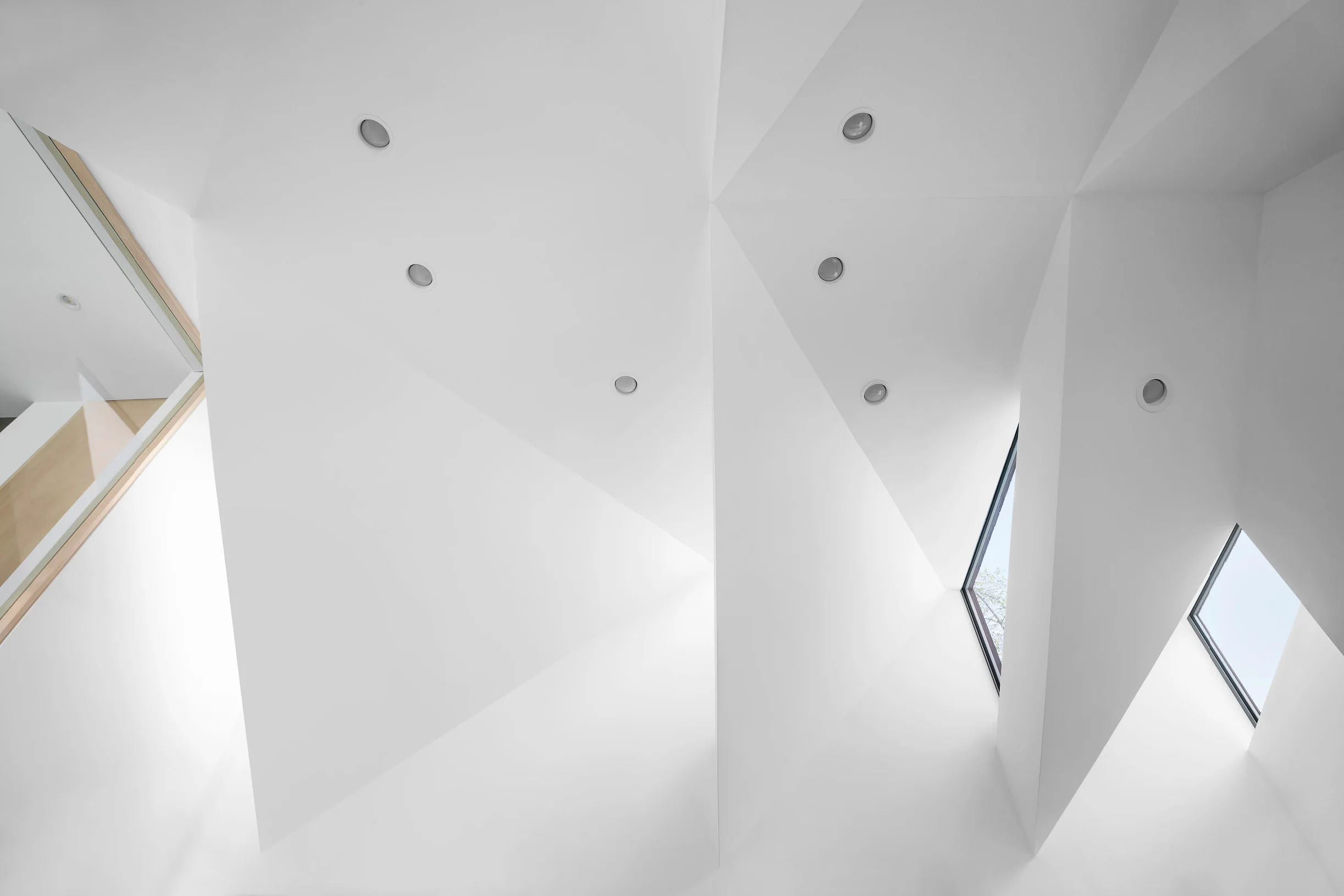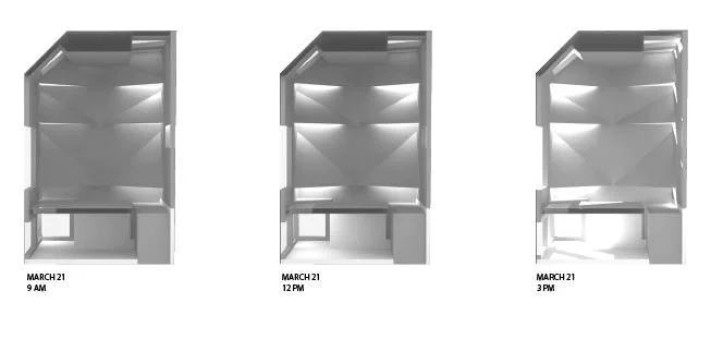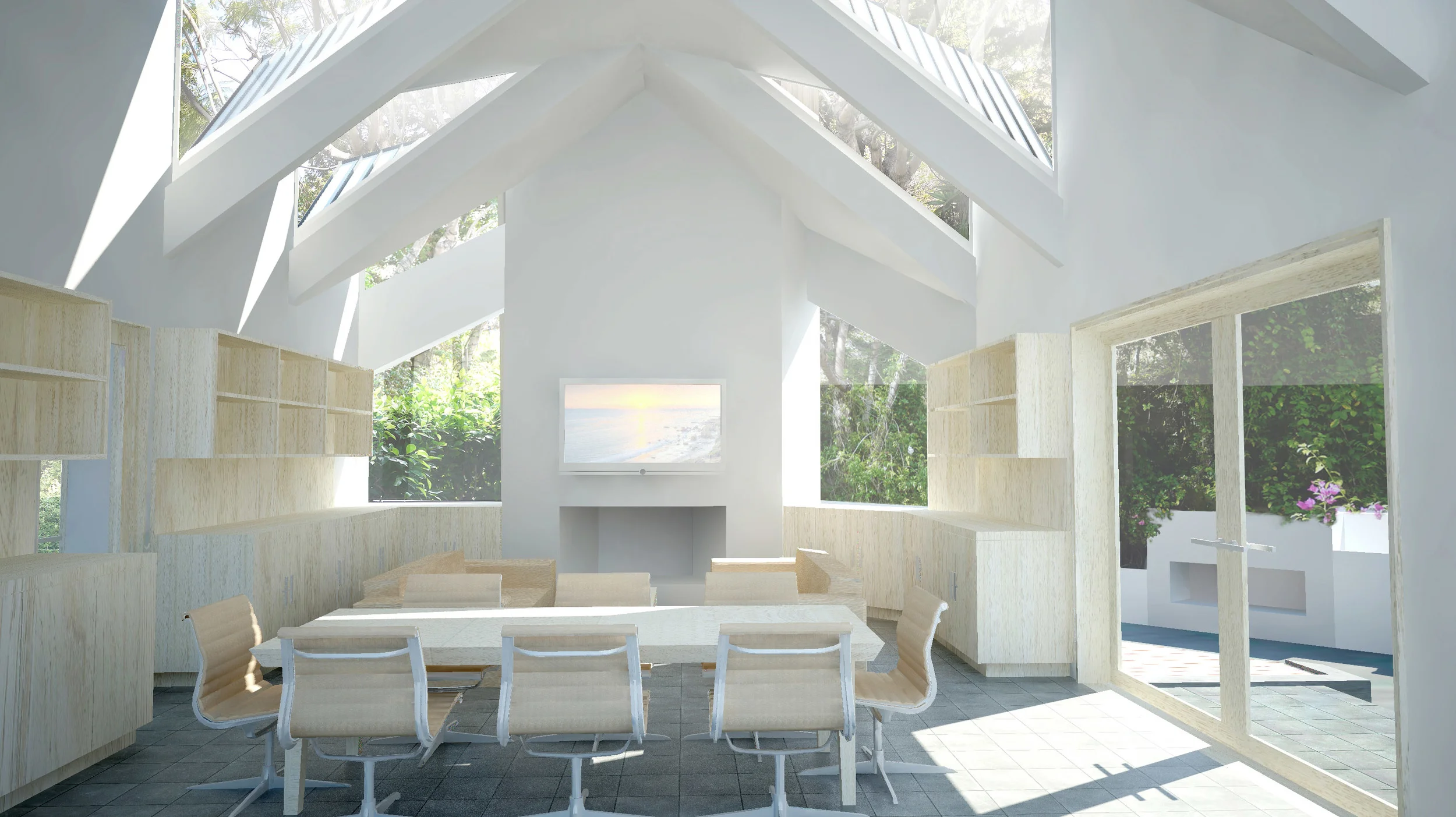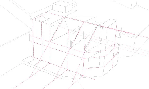 This geometric residential addition is a private study for two Downtown Los Angeles based attorneys working in the north light at the foot of a hillside in Serra Retreat, Malibu. Clerestory windows diffuse light, proportion and orient the space, and frame views up the hill. The massing of the Case Room, designed as a series of blocks obliquely sliced and assembled in a descending sequence in section, transitions in plan from a threshold with the existing house to a transposition of the existing exterior wall geometry. Material selections, including vertical timber siding and zinc standing seam roofs, striate and orient the geometric surfaces. The new second-floor landing adjacent to the Case Room, flanked by an elevator to the west and clerestory light well to the east, frames simultaneous views both into the room and above its roof toward the hillside. The dynamic interplay of reflected light on the ceiling surfaces throughout the day provides a gently modulating, diffused top lighting for contemplative work.